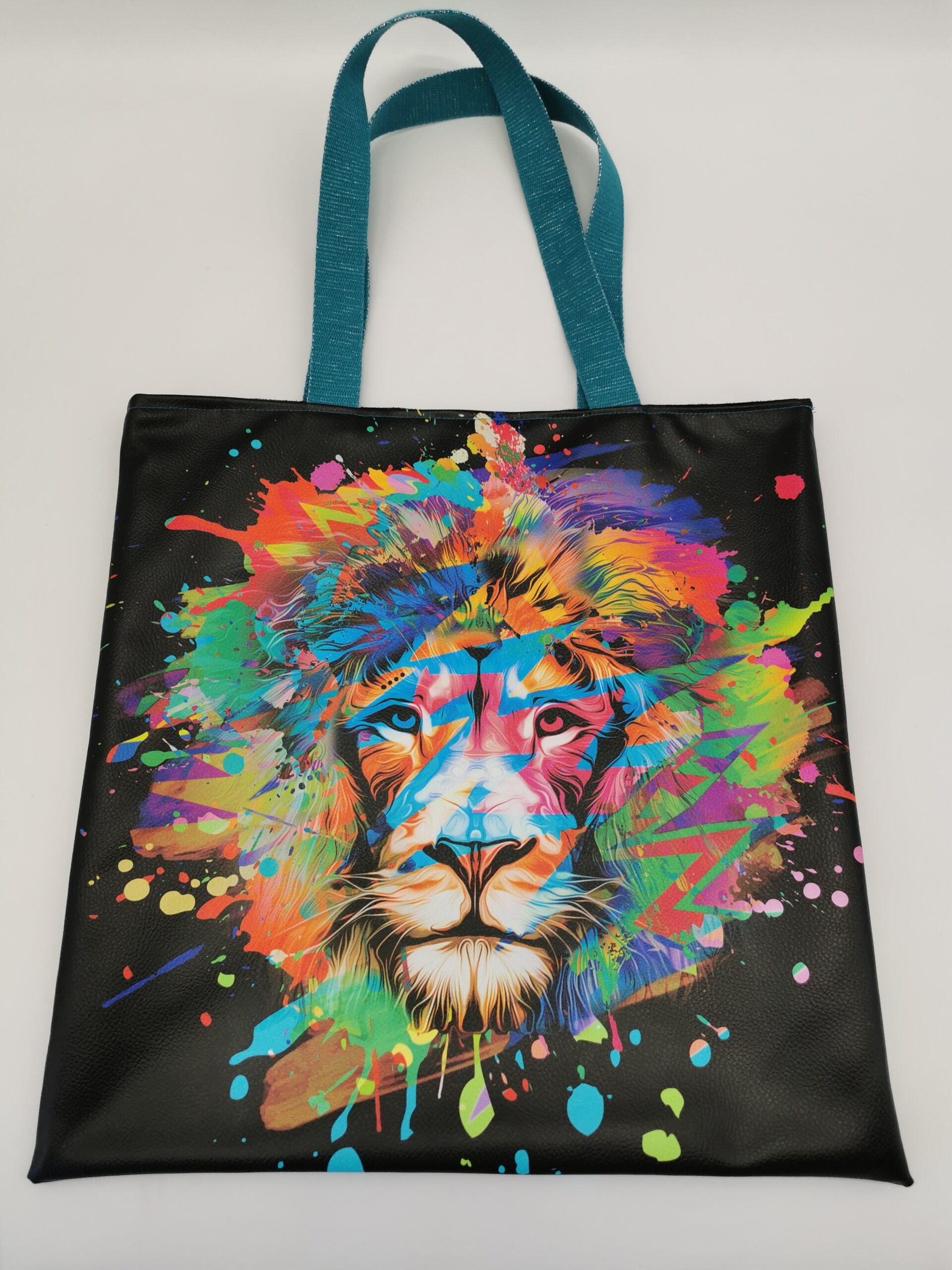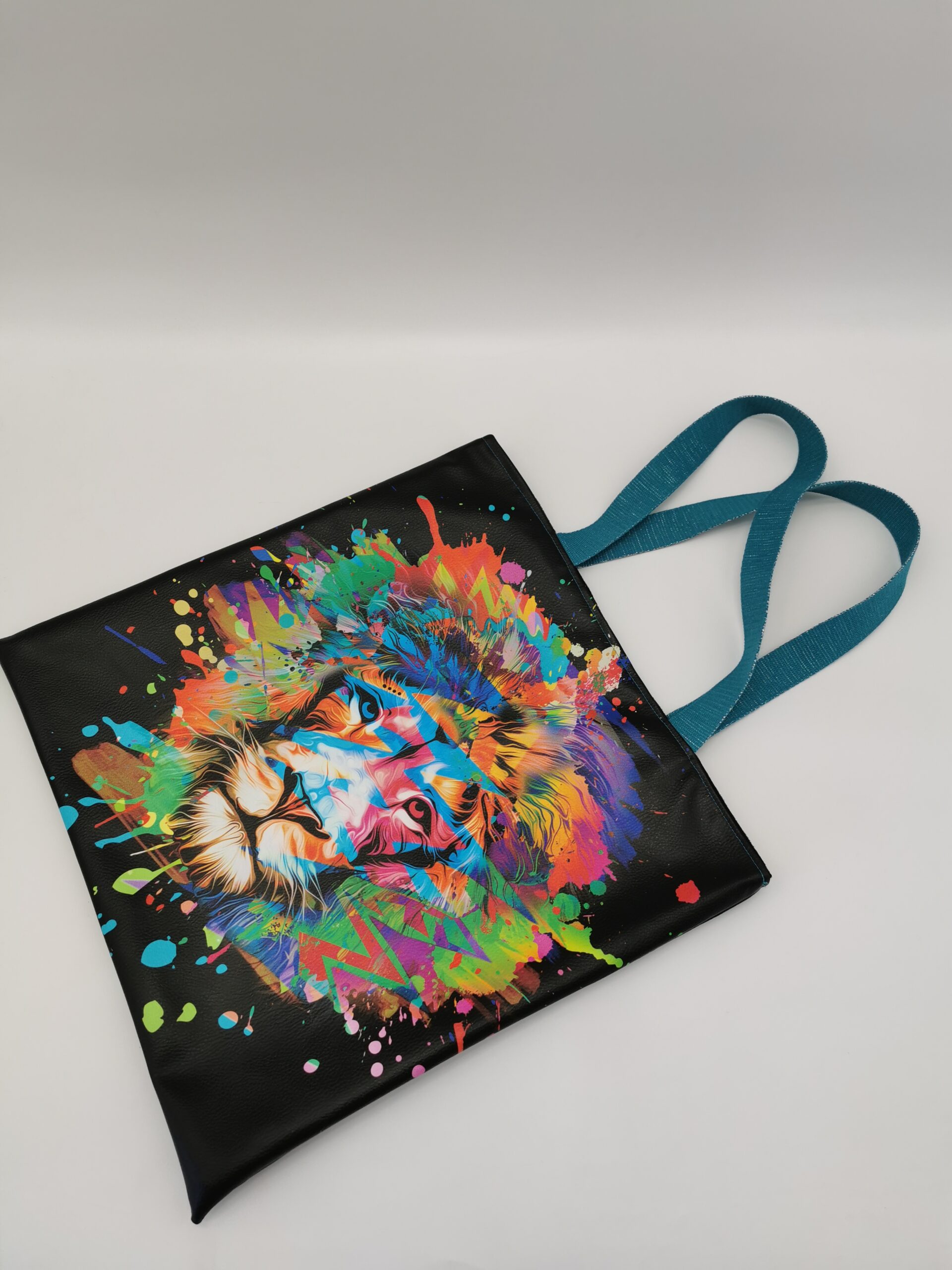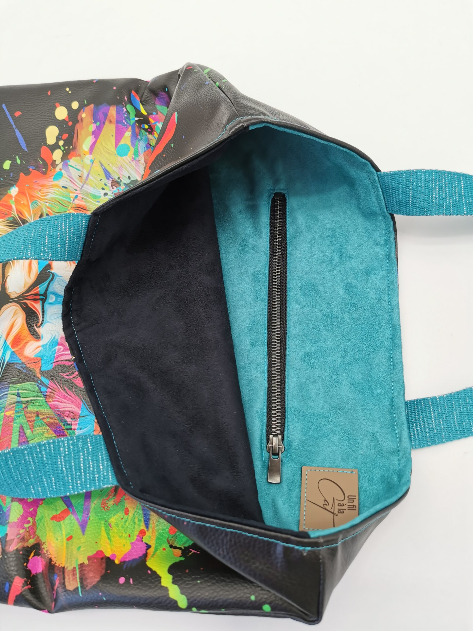 / Tote bag Collection Savane Lion multicolore intérieur suédine turquoise et noire