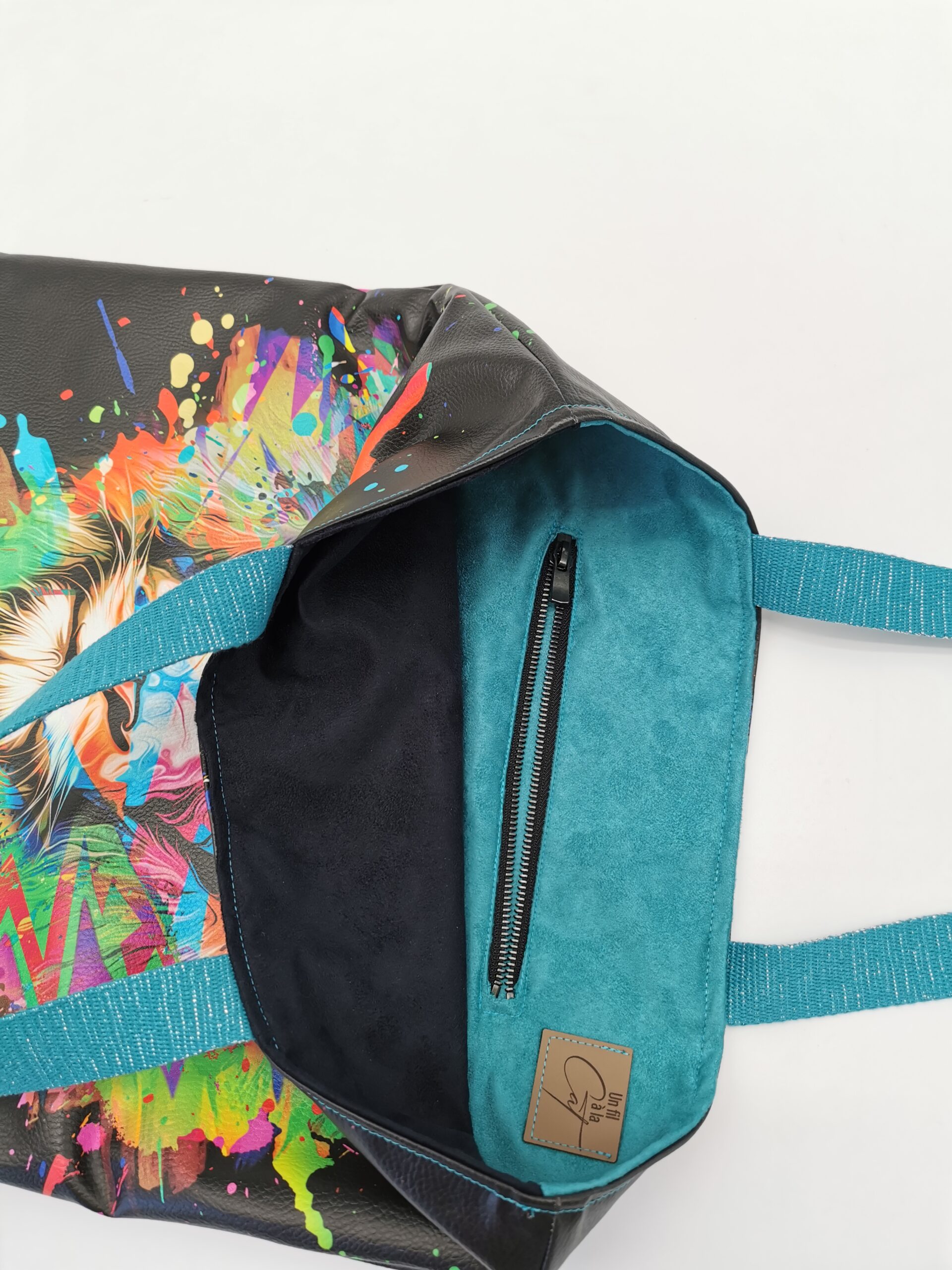 Tote bag Collection Savane Lion multicolore intérieur velours turquoise et noir