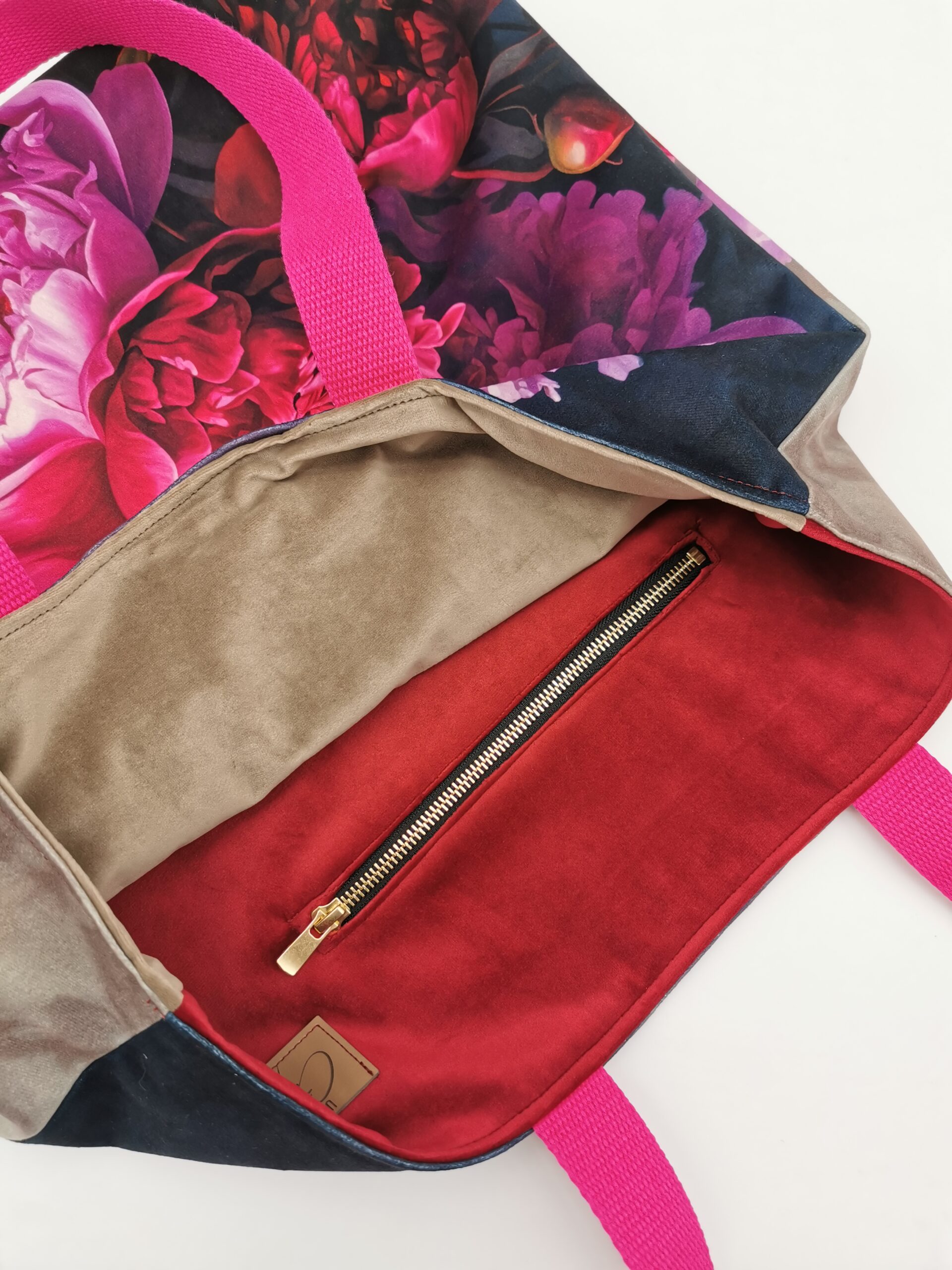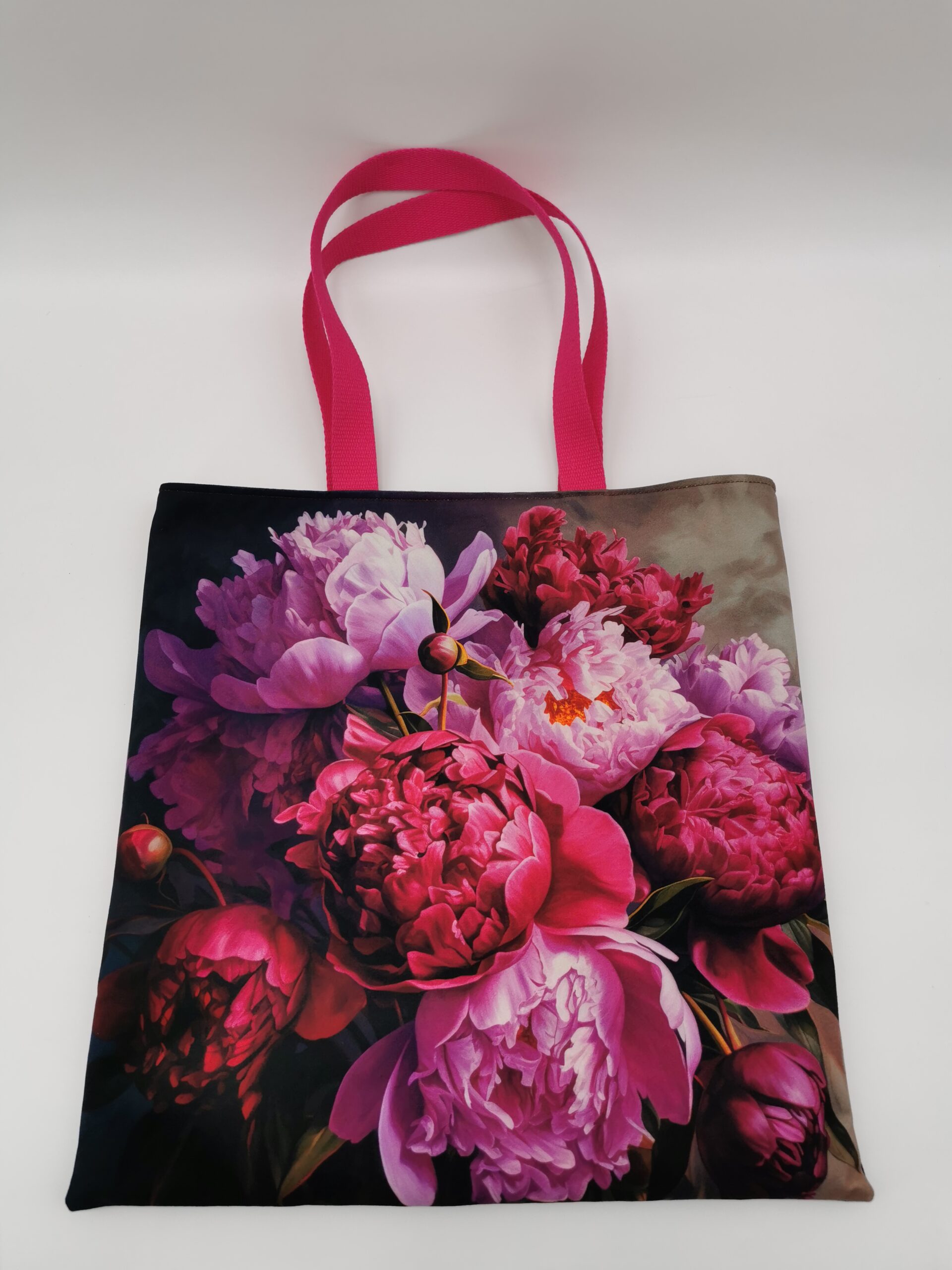 Tote bag Collection Symphonie Florale extérieur carrés velours « bouquet de pivoines »